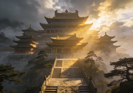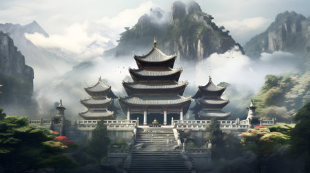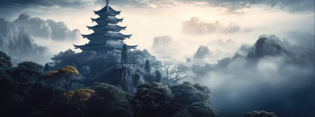 Aerial view of a pagoda in a foggy mountain landscape, mystique.