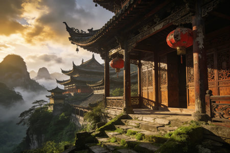 Chinese Mountains with Pagoda Mist-covered mountains with traditional Chinese architecture, featuring a pagoda perched on a cliff, with a serene