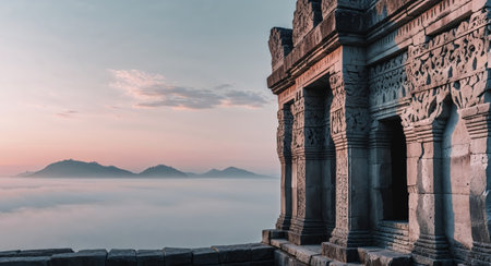 AI Generated. Ancient Stone Structure with Intricate Carvings at Sunrise