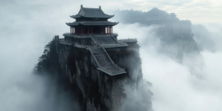 A hilltop temple surrounded by mist and clouds, creating an ethereal and tranquil mood.