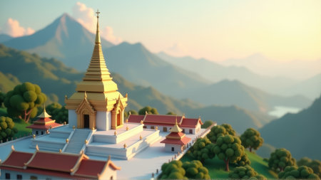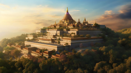 Golden Pagoda on Mountaintop at Sunrise, generative Ai