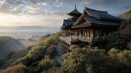 A tranquil Japanese temple nestled amidst vibrant greenery, showcasing exquisite architectural details and natural beauty, perfect for serene retreats.