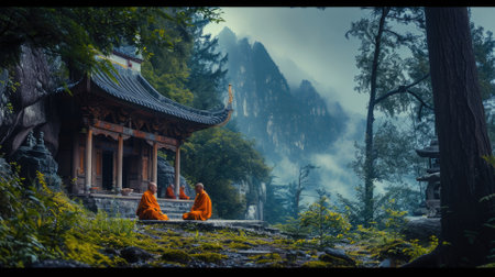 Monks in orange robes engage in peaceful meditation at sunrise, with the backdrop of a traditional mountain temple and misty, rolling hills. Resplendent.