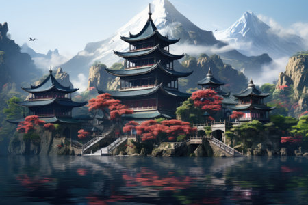 A painting of a pagoda in the middle of a lake, AI