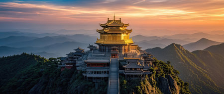 Panorama of golden pavilion at sunset in the mountains of China