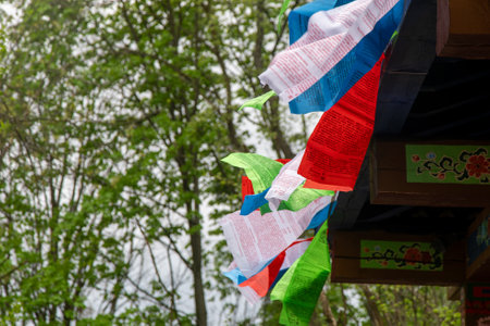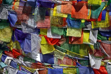Tibetan Buddhist Prayer Flag include red, green, yellow, blue and white colors in North Sikkim, India.