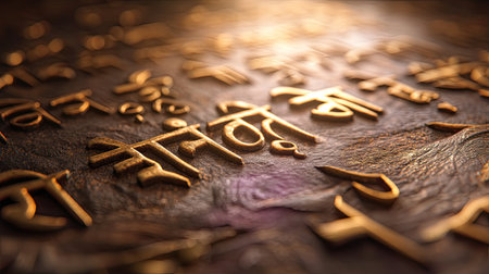 This captivating close-up image showcases intricate brass inscriptions on a textured surface, highlighting the artistic interplay of light and shadow.