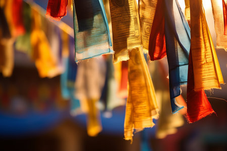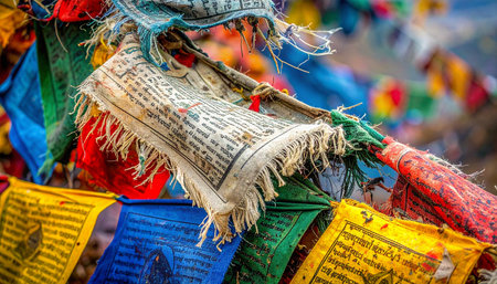A close-up view of vibrant Tibetan prayer flags, inscribed with sacred mantras, fluttering in the mountain breeze.