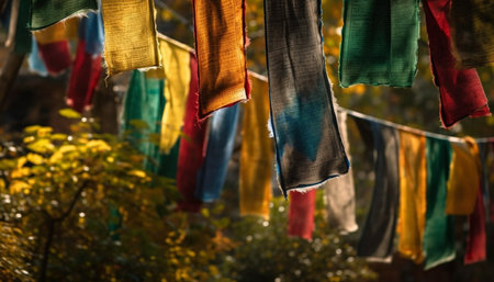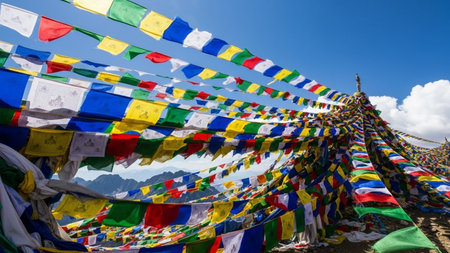 colorful prayer flags fluttering in the wind, created with generative ai