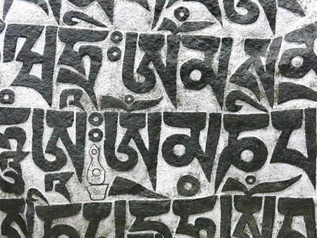 The Sanskrit mantra 'Om mani padme hum' inscribed and painted on a mani stone embedded in a wall of the Potala Palace in Lhasa, Tibet, China.