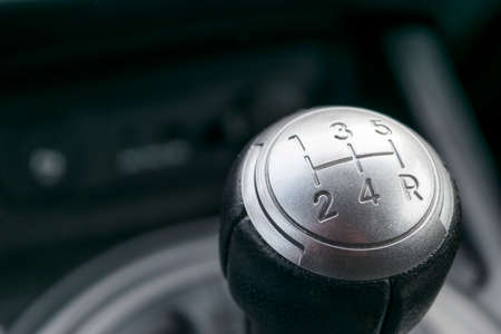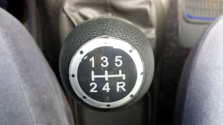 Manual transmission in the car, six gears in the car, gear lever in the car close up.