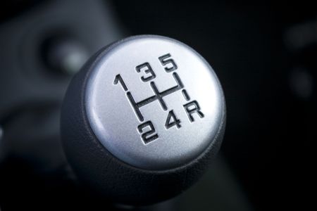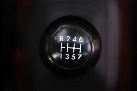 Closeup on gear lever. Five gears and reverse gear.