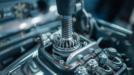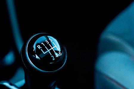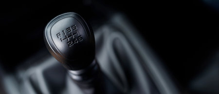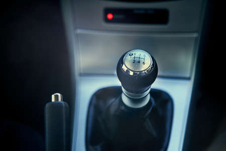 Close up view of a gear lever shift. Manual gearbox. Car interior details. Car transmission. Soft lighting. Abstract view