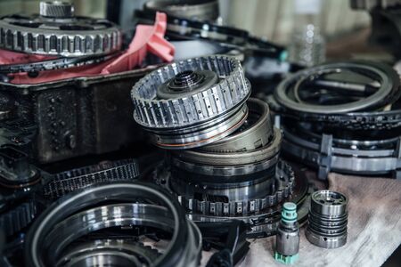 Details of a disassembled automatic transmission of a passenger car with a shallow depth of field