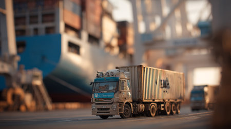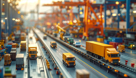 Miniature trucking scene showcases global shipping with harbor background and planes.