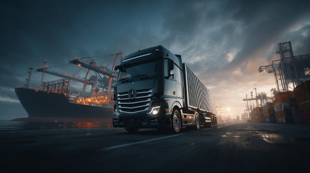 Modern Semi-Truck Transporting Cargo at Dusk Near a Busy Commercial Port