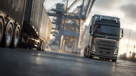 Modern semi-truck delivering shipping container near a cargo ship and port cranes.