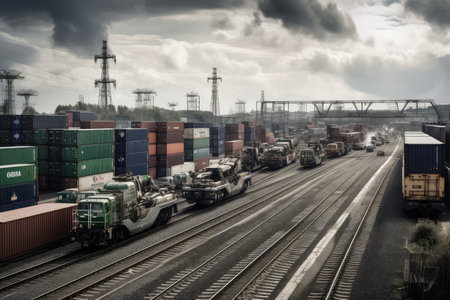 Witness the seamless movement of goods as containers are efficiently transported from the port to a cargo plane in this dynamic image. Trucks lined up, ready to embark on their journey, showcase the intricate logistics involved in global trade. The containers, securely stacked, symbolize the vast volume of goods being transported. This photograph captures the synchronized efforts and efficiency of the supply chain. Perfect for transportation, logistics, and business-related projects, this image encapsulates the seamless flow of commerce and the interconnected nature of the global economy.