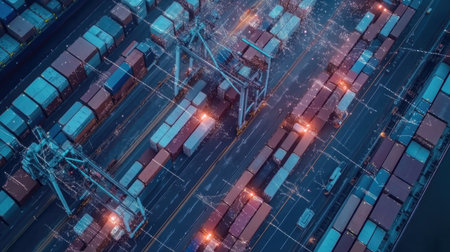 A dynamic aerial view captures a busy container port at dusk, featuring illuminated cargo ships and towering cranes bustling with activity.