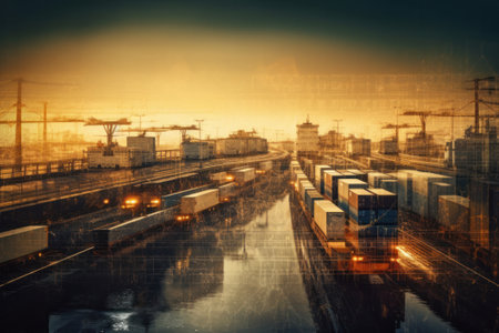 Industrial scene: containers, cranes and cargo being loaded., generative AI