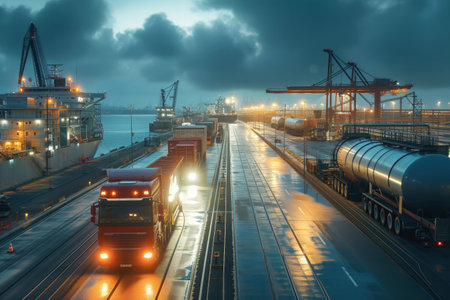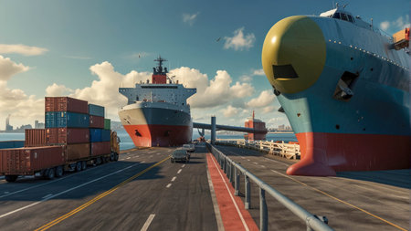 Transportation and logistics network with container cargo ship and trucks. Emphasizing smart solutions and growth in distribution efficiency within the industrial sector.