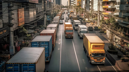 A large number of trucks and cars are driving on a road, AI