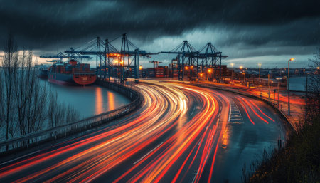 Dramatic long exposure night shot of industrial port with cargo cranes and light trails