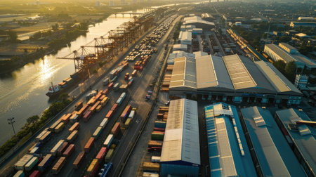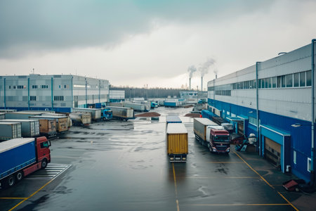 Generative AI Aerial perspective of a busy logistics center, warehouses, trucks, loading activity, dynamic operations, realistic depiction