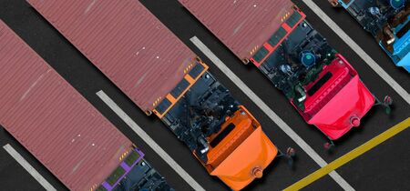 Trucks in the parking lot, top view on a truck. Logistics transport in the parking lot waiting for unloading