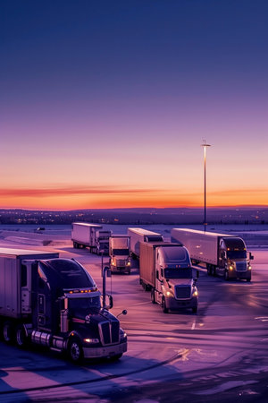 Truck transport fleet parked at delivery company yard for efficient logistics operations