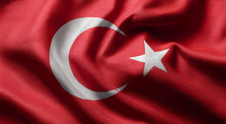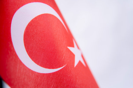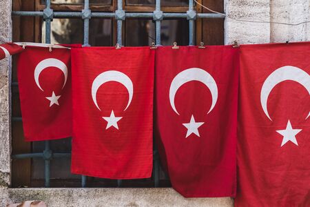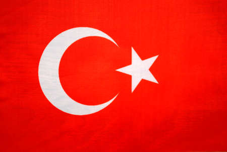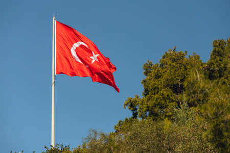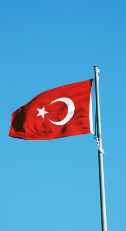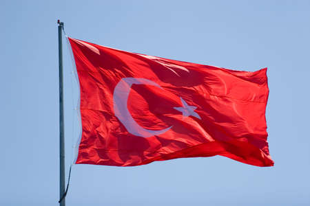 Red turkish flag waving in the wind, showing the white crescent moon and star, a symbol of Turkey's national identity