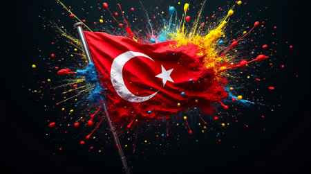 The vibrant Turkish flag stands prominently against a dynamic backdrop of splattered colors, representing the nation's rich culture and spirit. This striking visual conveys unity and pride.