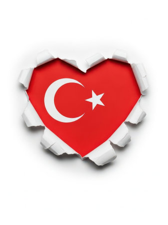 A heart-shaped tear revealing the Turkish flag with a white star and crescent on a red background, symbolizing love and patriotism for Turkey.