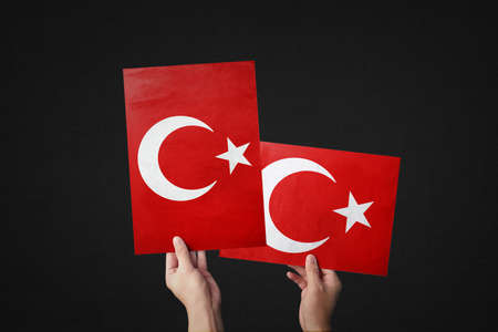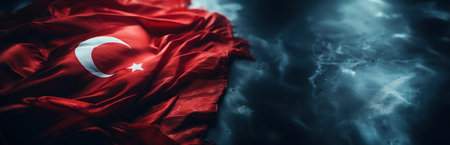 Wavy flag of Turkey, bright red fabric, dark mystical background, banner, copy space.