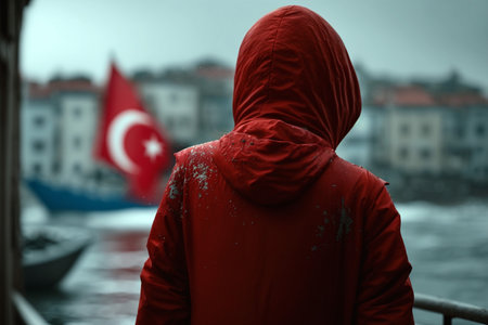 Woman in raincoat from behind with turkish flag, Türkiye flag