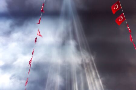 Many Turkish national flags on rope against background of blue sky and clouds.