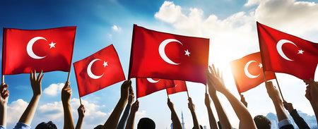 Turkish citizens joyfully waving national flags in celebration beneath a bright sky, embodying unity and pride during a national holiday