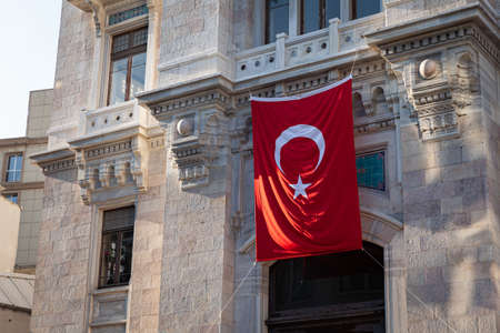 The Turkish flag flies in the wind on a flagpole against the blue sky. The national red and white flag of the country of Turkey is hoisted over the city.