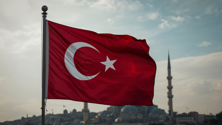A vibrant Turkish flag flutters in the breeze as the sun sets in Istanbul. A stunning mosque stands tall in the background, showing Turkeys rich culture and history.