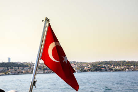 Waving Turkish flag on a ferry boat against Bosporus or Strait of Istanbul at sunset