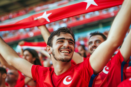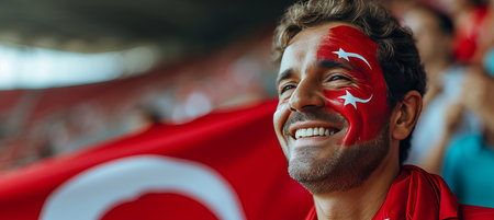Excited turkey flag painted man supporting team at football game with blurry stadium background