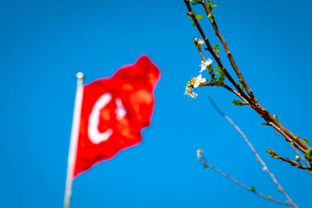 Turkish Flag and spring blossoms. Turkish Youth concept. Turkish nation. Turkish national days. 23 april, 19 may, 15 july, 29 october, 30 august, 10 november