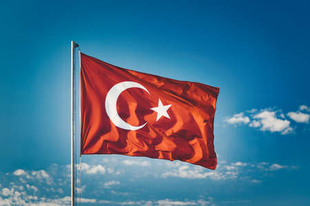 Turkish flag waving in the wind against the background of the sky. White crescent moon and star on red turkish flag