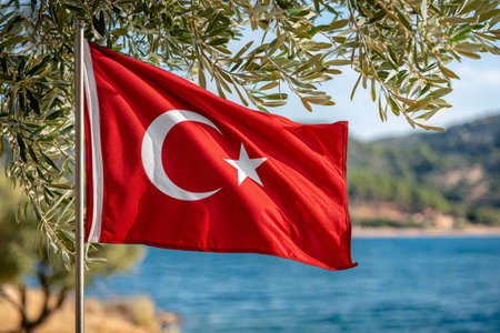 Turkey flag flying against a blue sky, framed by olive tree leaves and a tranquil sea