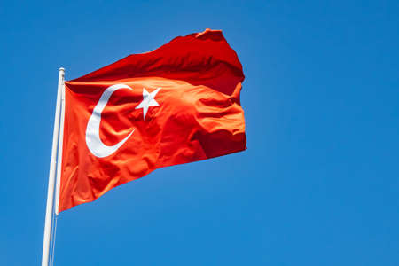 View of red and white Turkish flag with a moon and star on bright blue sky background.