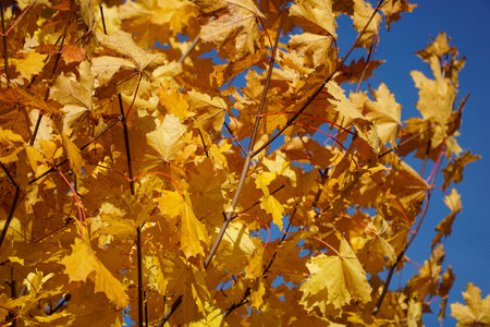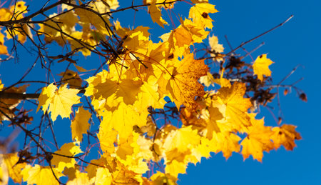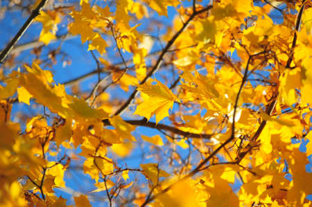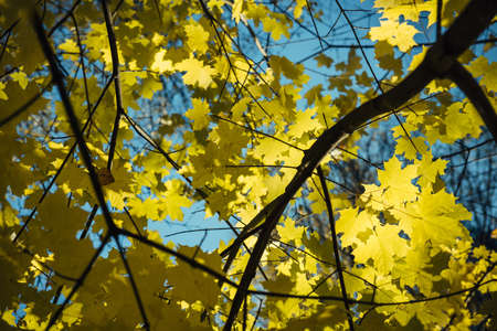 Yellow maple leaves on background of blue sky, warm autumn. Maple branches, close up. Natural backgrounds, Wallpaper.