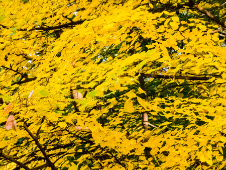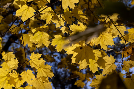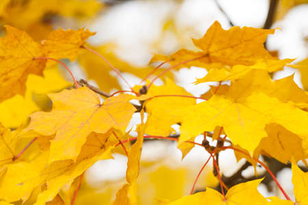 branches of a light yellow foliage maple in an autumn park in nature, detail during sunny weather