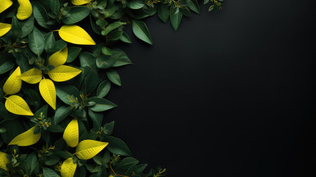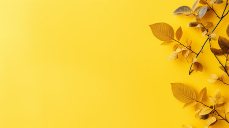 Minimalist plant background Bright green branch is lying on a yellow background Flat lay Modern minimalistic mockup with empty space.