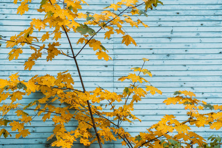 Golden autumn leaves stretch across a blue wooden wall in soft daylight. Color harmony, seasonal transition, urban nature contrast, natural design inspiration..