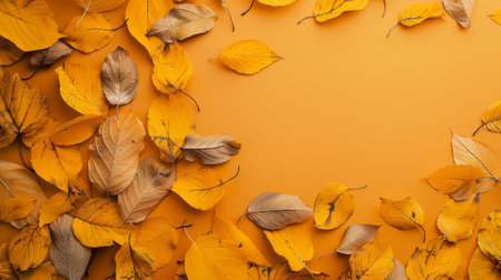 Top view of yellow and brown dry autumn leaves on pastel orange background, with ample copy space